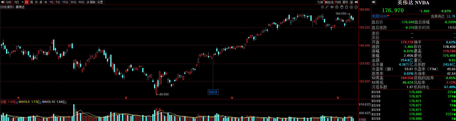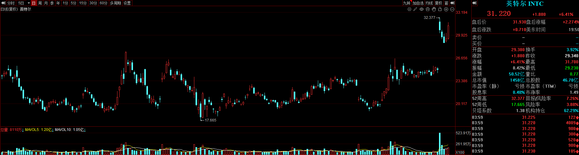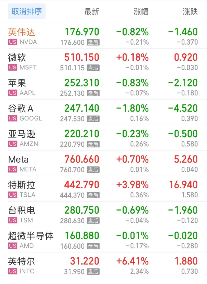 热门美股中,英伟达跌0.82%,微软涨0.18%,苹果跌0.83%,谷歌C跌1.79%,谷歌A跌1.80%,亚马逊跌0.23%,Meta涨0.70%,特斯拉涨3.98%,台积电跌0.69%,超微半导体跌0.01%,英特尔涨6.41%。
