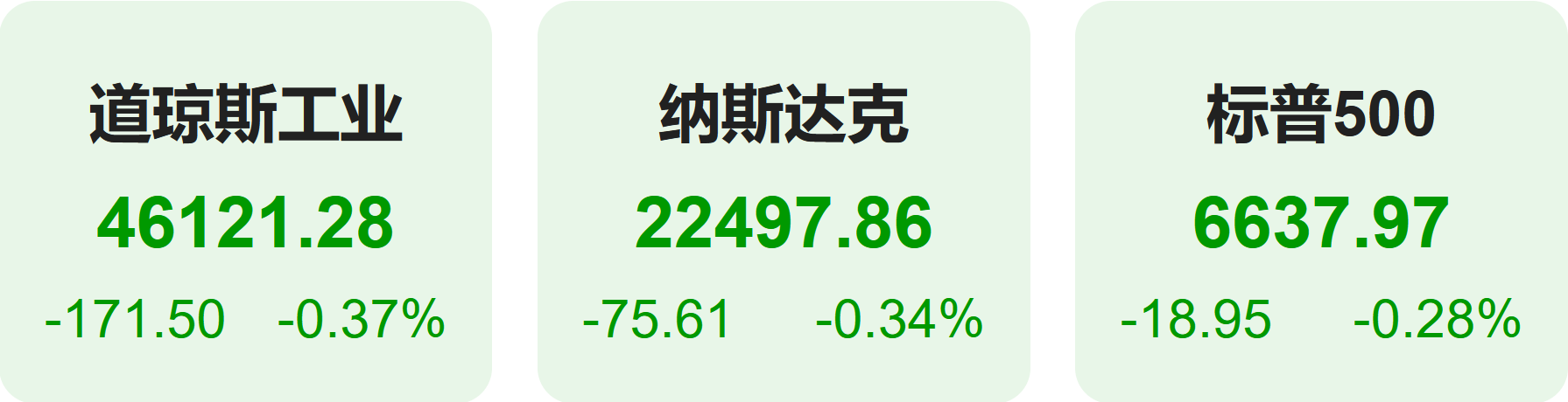 截至收盘,道琼斯指数跌0.37%,报46,121.28点;标普500指数跌0.28%,报6,637.97点;纳斯达克指数跌0.33%,报22,497.86点。