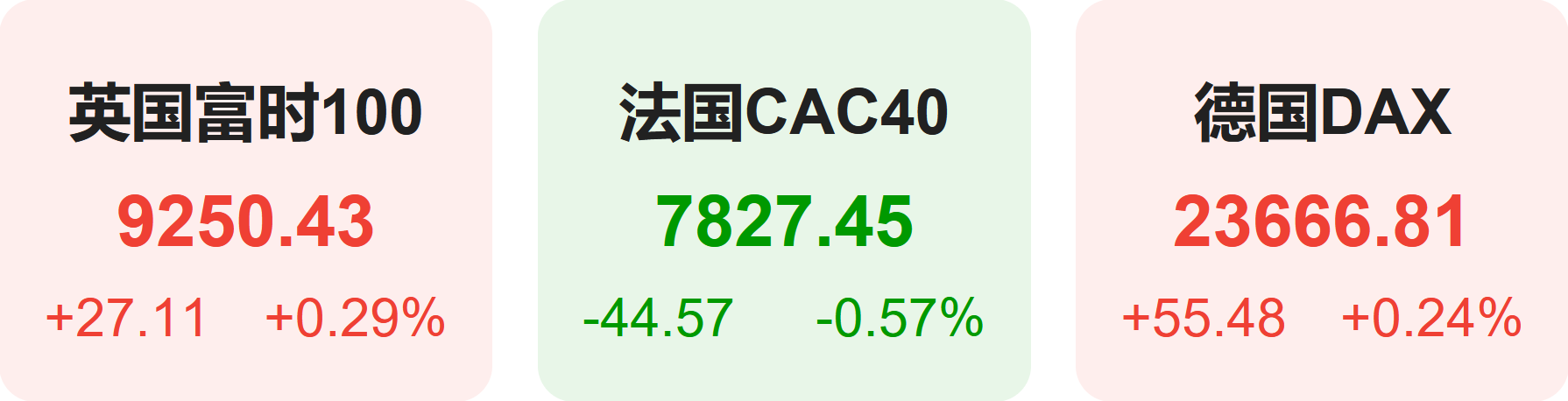 欧洲股市方面,英国富时100指数小幅上涨0.29%,报9250点。法国CAC40指数小幅下跌0.57%,报7827点。德国DAX指数小幅上涨0.23%,报23667点。