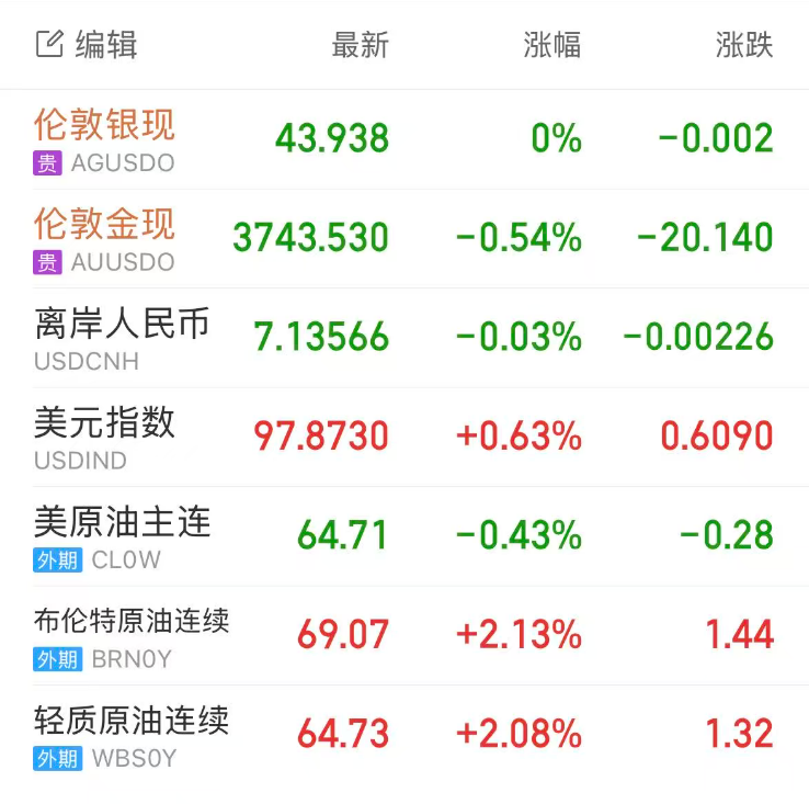因美元走强,现货黄金从历史高位回落,随后收复部分失地,伦敦金最终收跌0.59%,收报3741.47美元/盎司;伦敦银收跌0.05%,报43.919美元/盎司。