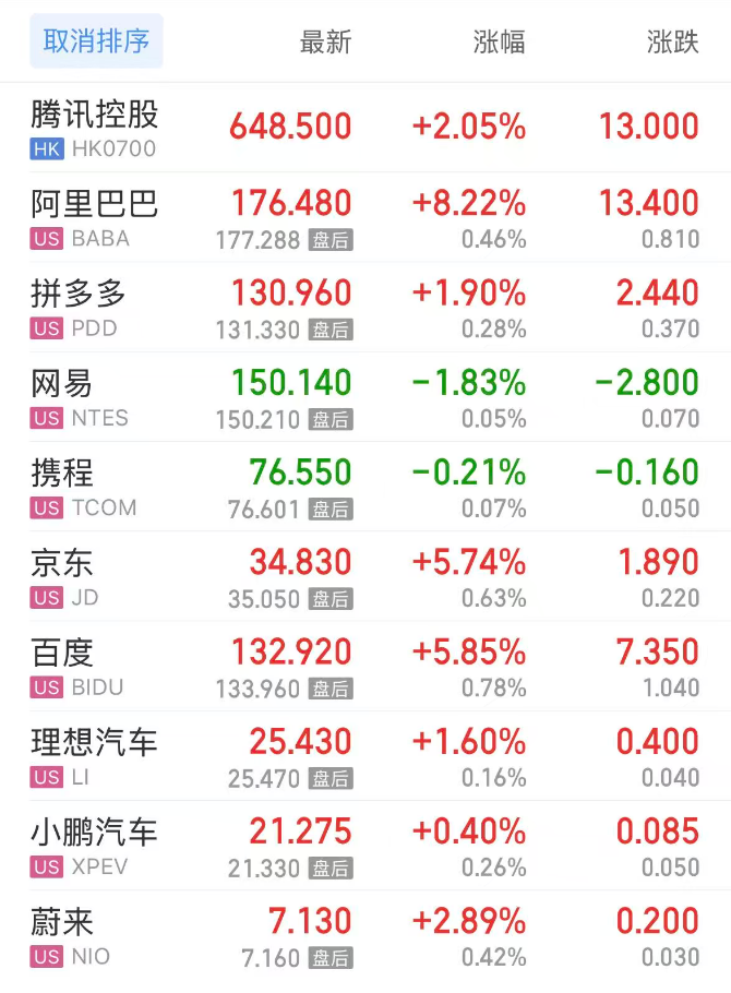 热门中概股方面,腾讯控股(港股)涨2.05%,阿里巴巴涨8.22%,拼多多涨1.90%,网易跌1.83%,携程跌0.21%,百度涨5.85%,理想汽车涨1.60%,小鹏汽车涨0.40%,蔚来涨2.89%。