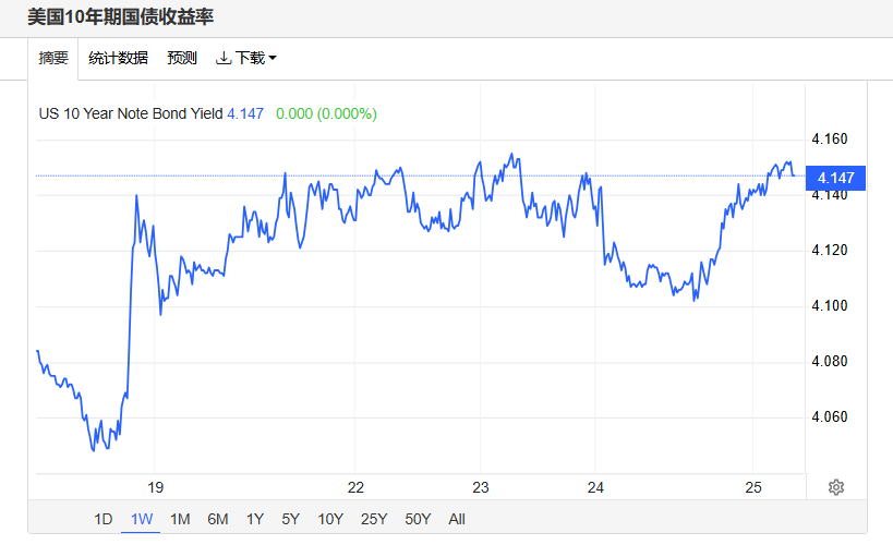 美债收益率小幅攀升,基准的10年期美债收益率收报4.147%,对美联储政策利率敏感的2年期美债收益率收报3.612%。