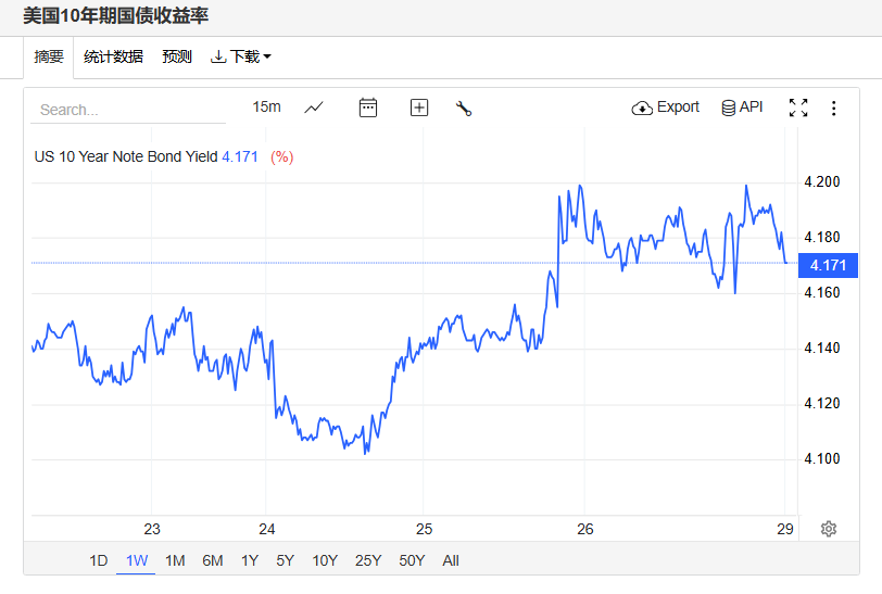上周五,美债收益率小幅攀升,基准的10年期美债收益率收报4.171%,对美联储政策利率敏感的2年期美债收益率收报3.647%。