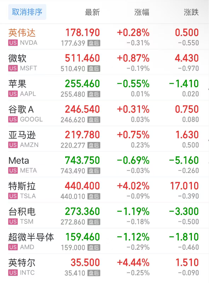 上周五热门美股中,英伟达涨0.28%,微软涨0.87%,苹果跌0.55%,谷歌C涨0.25%,谷歌A涨0.31%,亚马逊涨0.75%,Meta跌0.69%,特斯拉涨4.02%,台积电跌1.19%,超微半导体跌1.12%,英特尔涨4.44%。