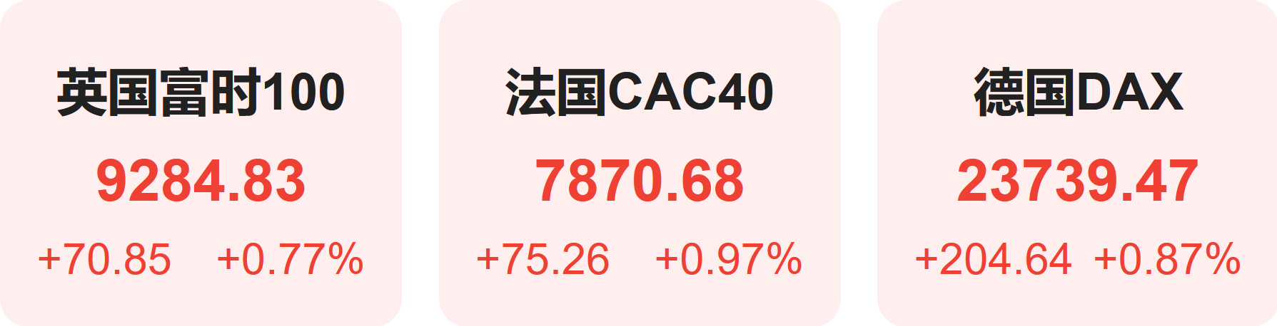 上周五,欧洲股市方面,英国富时100指数小幅上涨0.77%,报9285点。法国CAC40指数小幅上涨0.97%,报7871点。德国DAX指数小幅上涨0.87%,报23739点。