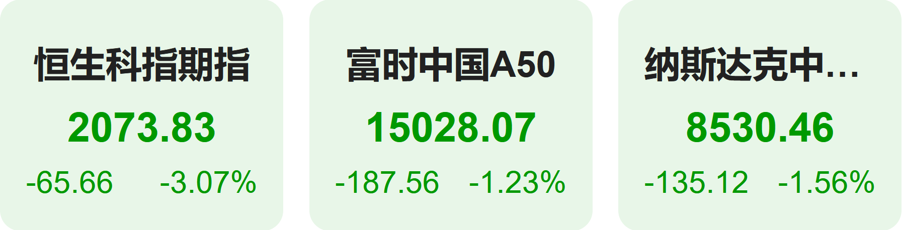 9月26日,隔夜恒生科技指数期货下跌3.07%,纳斯达克中国金龙指数下跌1.56%,富时中国A50指数下跌1.23%。