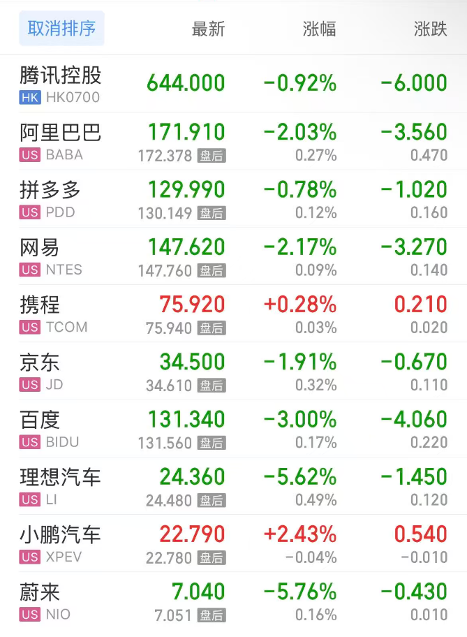 上周五热门中概股方面,腾讯控股(港股)跌0.92%,阿里巴巴跌2.03%,拼多多跌0.78%,网易跌2.17%,携程涨0.28%,百度跌3.00%,理想汽车跌5.62%,小鹏汽车涨2.43%,蔚来跌5.76%。