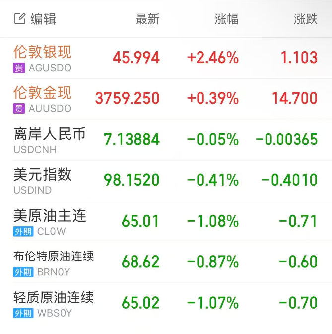 伦敦金最终收涨0.39%,收报3759.26美元/盎司,周线录得6连涨;现货白银创逾14年新高,伦敦银最终收涨2.46%,报45.994美元/盎司,周线同样与黄金录得6连涨。