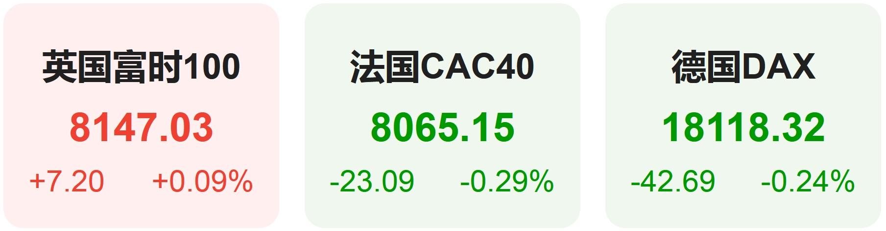 欧洲股市方面,英国富时100指数小幅上涨0.09%,报8147点。法国CAC40指数小幅下跌0.29%,报8065点。德国DAX指数小幅下跌0.24%,报18118点。