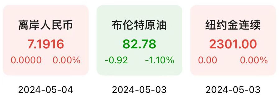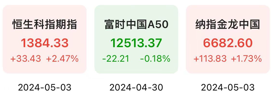 5月3日,恒生科技指数期货上涨2.47%,纳斯达克中国金龙指数上涨1.73%,富时中国A50指数小幅下跌0.18%。