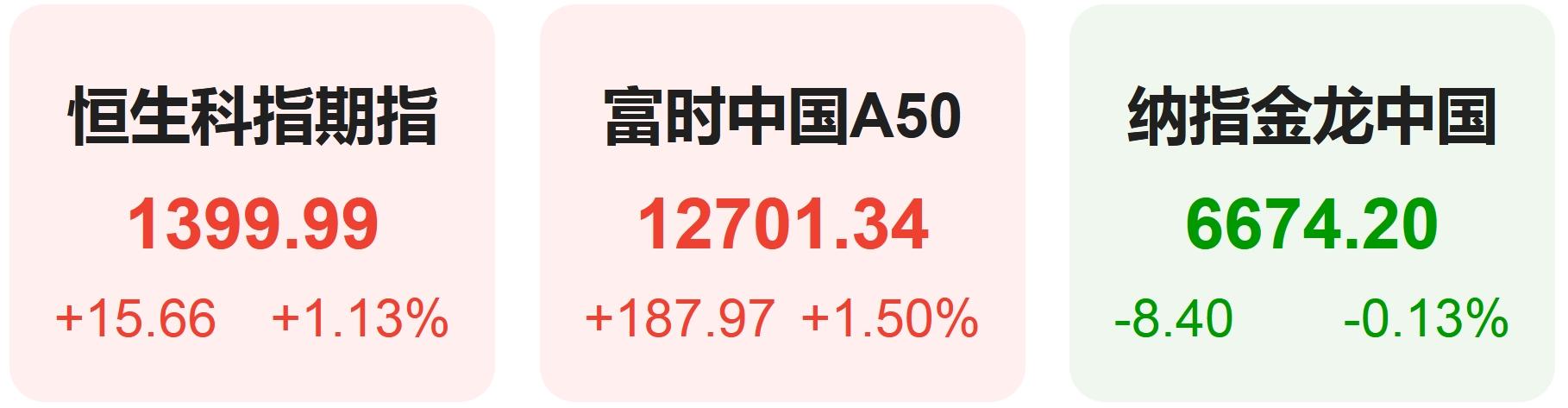 隔夜恒生科技指数期货上涨1.13%,纳斯达克中国金龙指数下跌0.13%,富时中国A50指数上涨1.50%。