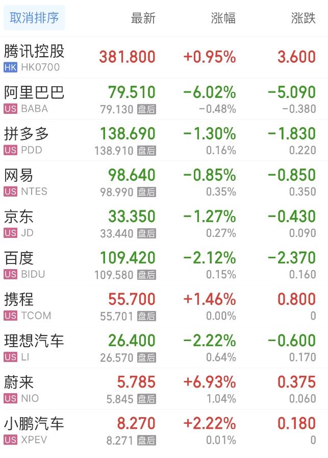 热门中概股方面,腾讯控股(港股)涨0.95%,阿里巴巴跌6.02%,拼多多跌1.30%,网易跌0.85%,百度跌2.12%,携程涨1.46%,理想汽车跌2.22%,蔚来涨6.93%,小鹏汽车涨2.23%。