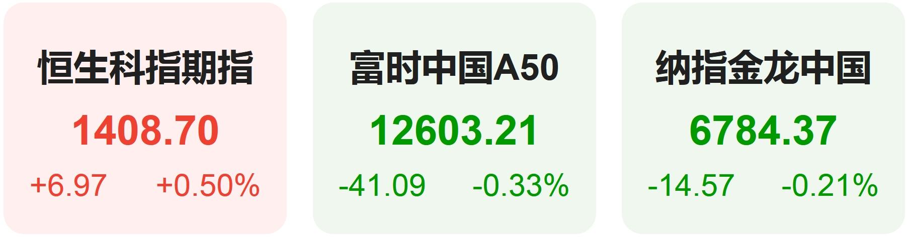 隔夜恒生科技指数期货上涨0.50%,纳斯达克中国金龙指数下跌0.21%,富时中国A50指数下跌0.33%。
