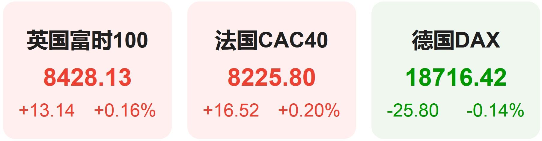 欧洲股市方面,英国富时100指数小幅上涨0.16%,报8428点。法国CAC40指数小幅上涨0.20%,报8226点。德国DAX指数小幅下跌0.14%,报18716点。
