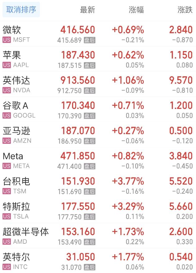 热门美股中,微软涨0.69%,苹果涨0.62%,英伟达涨1.06%,谷歌A涨0.71%,亚马逊涨0.27%,Meta涨0.82%,台积电涨3.77%,特斯拉涨3.29%,超微半导体涨1.73%,英特尔涨1.77%。