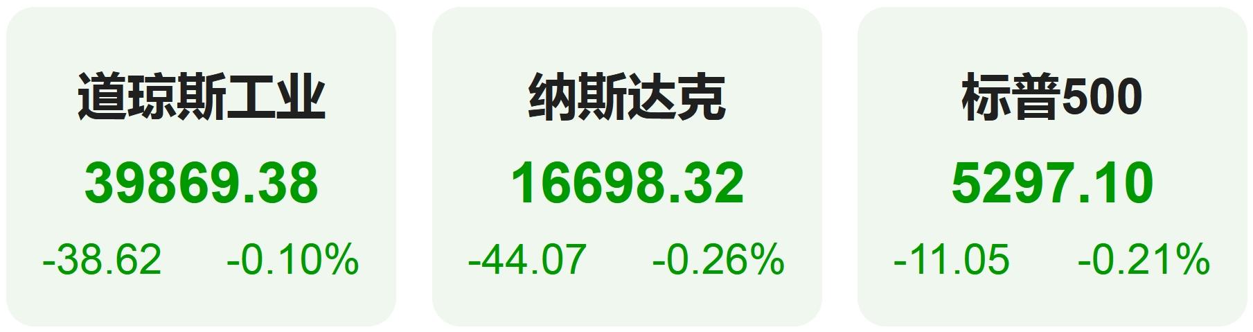 截至收盘,标普500指数跌0.21%,报5297.10点;道琼斯指数跌0.10%,报39869.38点;纳斯达克指数跌0.26%,报16698.32点。