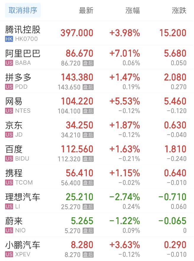 热门中概股方面,腾讯控股(港股)涨3.98%,拼多多涨1.47%,网易涨5.53%,百度涨1.63%,携程涨1.15%,理想汽车跌2.74%,蔚来跌1.22%,小鹏汽车涨3.63%。