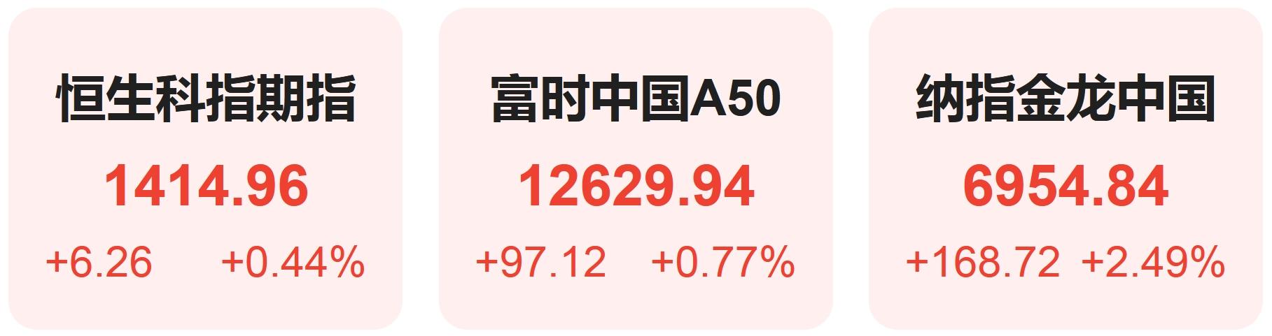 隔夜恒生科技指数期货上涨0.44%,纳斯达克中国金龙指数上涨2.49%,富时中国A50指数上涨0.77%。