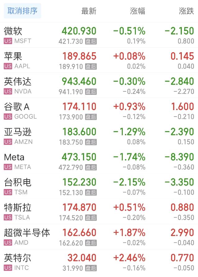 热门美股中,微软跌0.51%,苹果涨0.08%,英伟达跌0.30%,谷歌A涨0.93%,亚马逊跌1.29%,Meta跌1.74%,台积电跌2.15%,特斯拉涨0.51%,超微半导体涨1.87%,英特尔涨2.46%。