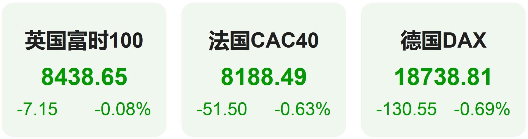 欧洲股市方面,英国富时100指数小幅下跌0.08%,报8439点。法国CAC40指数小幅下跌0.63%,报8188点。德国DAX指数小幅下跌0.69%,报18739点。