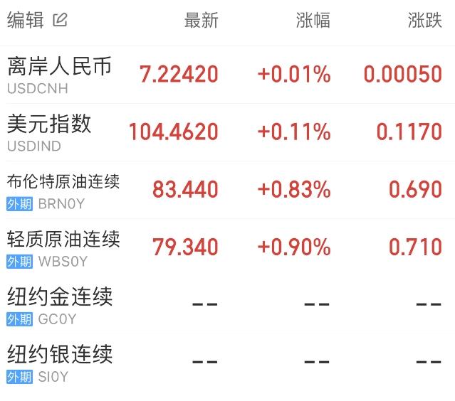 原油先跌后涨。WTI原油收涨0.9%,报79.34美元/桶;布伦特原油收涨0.83%,报83.44美元/桶。
