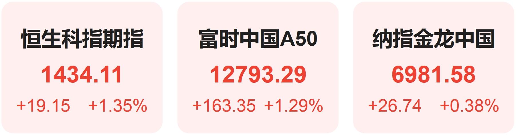 上周五恒生科技指数期货上涨1.35%,纳斯达克中国金龙指数上涨0.38%,全周累涨6.53%,富时中国A50指数上涨1.29%。
