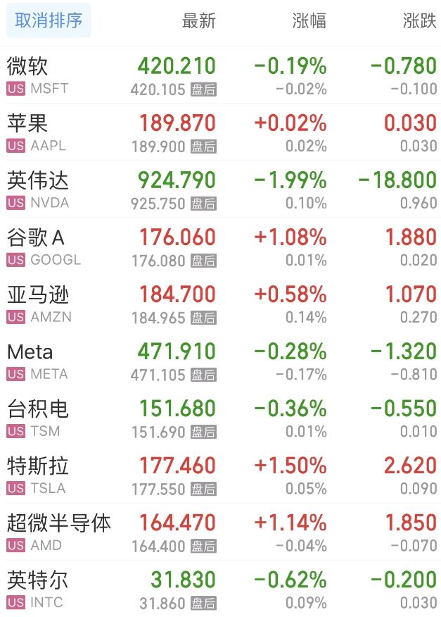 上周五热门美股中,微软跌0.19%,苹果涨0.02%,英伟达跌1.99%,谷歌A涨1.08%,亚马逊涨0.58%,Meta跌0.28%,台积电跌0.36%,特斯拉涨1.50%,超微半导体涨1.14%,英特尔跌0.62%。