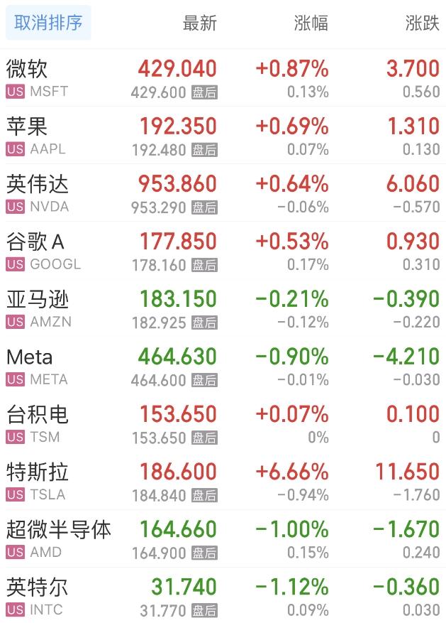 随着大盘再创新高,热门科技股中,微软、英伟达、谷歌、高通等一众科技巨头也携手创出新高。其中微软涨0.87%,英伟达涨0.64%,苹果涨0.69%,谷歌A涨0.53%。亚马逊跌0.21%,Meta跌0.90%,台积电涨0.07%,超微半导体跌1.00%,英特尔跌1.12%。