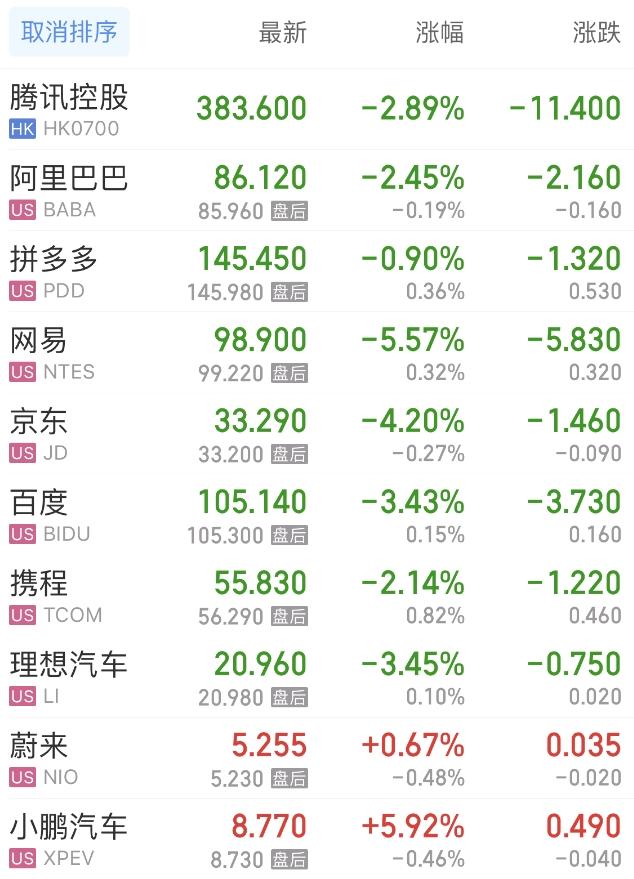 热门中概股方面,腾讯控股(港股)跌2.89%,阿里巴巴跌2.45%,拼多多跌0.90%,网易跌5.57%,百度跌3.43%,携程跌2.14%,理想汽车跌3.46%,蔚来涨0.67%。
