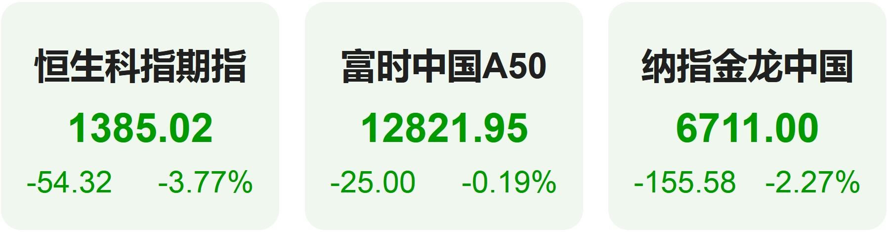 隔夜恒生科技指数期货下跌3.77%,纳斯达克中国金龙指数下跌2.27%,富时中国A50指数下跌0.19%。