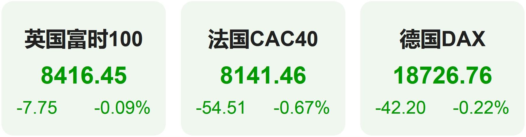 欧洲股市方面,英国富时100指数小幅下跌0.09%,报8416点。法国CAC40指数小幅下跌0.66%,报8141点。德国DAX指数小幅下跌0.22%,报18727点。