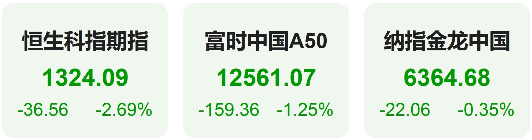 上周五,恒生科技指数期货下跌2.69%,纳斯达克中国金龙指数下跌0.35%,富时中国A50指数下跌1.25%。