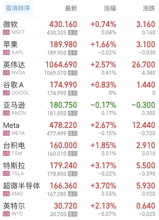 上周五,热门美股中,微软涨0.74%,苹果涨1.66%,谷歌A涨0.83%,亚马逊跌0.17%,Meta涨2.67%,台积电涨1.85%,特斯拉涨3.17%,超微半导体涨3.70%,英特尔涨2.13%。