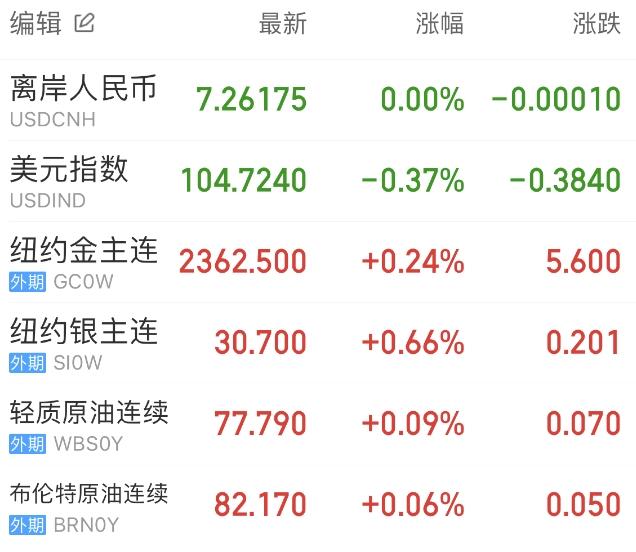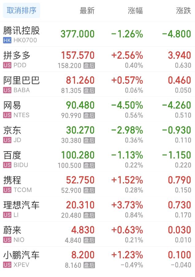 上周五,热门中概股方面,腾讯控股(港股)跌1.26%,拼多多涨2.56%,阿里巴巴涨0.57%,网易跌4.50%,百度跌1.13%,携程涨1.52%,理想汽车涨3.73%,蔚来涨0.63%,小鹏汽车涨1.23%。