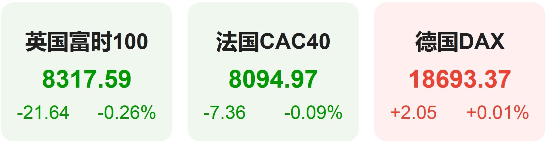 上周五,欧洲股市方面,英国富时100指数小幅下跌0.26%,报8318点。法国CAC40指数小幅下跌0.09%,报8095点。德国DAX指数小幅上涨0.01%,报18693点。