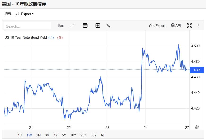 上周五,基准的10年期美债收益率收报4.47%,对美联储政策利率最敏感的2年期美债收益率收报4.93%。