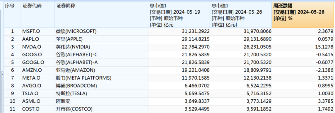 上周,美股大型科技股涨跌不一,微软、苹果、英伟达、Meta分别累计上涨2.37%、0.06%、15.13%、1.34%,谷歌-A、亚马逊分别累计下跌0.61%、2.14%。英伟达市场表现大放异彩,再创历史新高,市值突破2.6万亿美元,单周市值增加3447亿美元(合人民币24967亿元)。今年以来,英伟达已累计上涨115%。