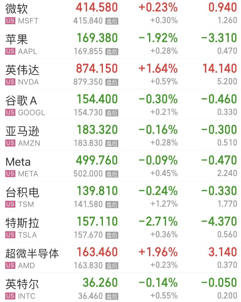 美股大型科技股多数下跌。苹果跌1.92%,谷歌母A跌0.3%,亚马逊跌0.16%,Meta跌0.09%,奈飞涨1.71%,微软涨0.23%。