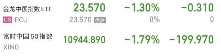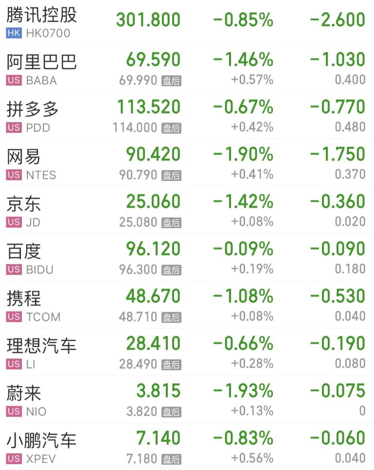 热门中概股多数走低,,阿里巴巴跌1.43%,京东跌1.42%,小鹏汽车跌0.69%,拼多多跌0.67%,理想汽车跌0.66%,百度跌0.09%。