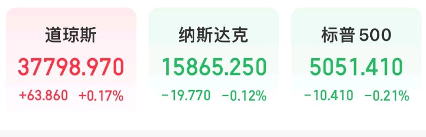 截至收盘,道琼斯指数涨0.17%,报37,798.97点,终结日线六连跌;标普500指数跌0.21%,报5,051.41点;纳斯达克综合指数跌0.12%,报15,865.25点,双双连跌三日。