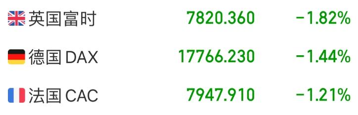 欧洲股市方面,英国富时100指数下跌1.82%,报7820点。法国CAC40指数下跌1.21%,报7948点。德国DAX指数下跌1.44%,报17766点。