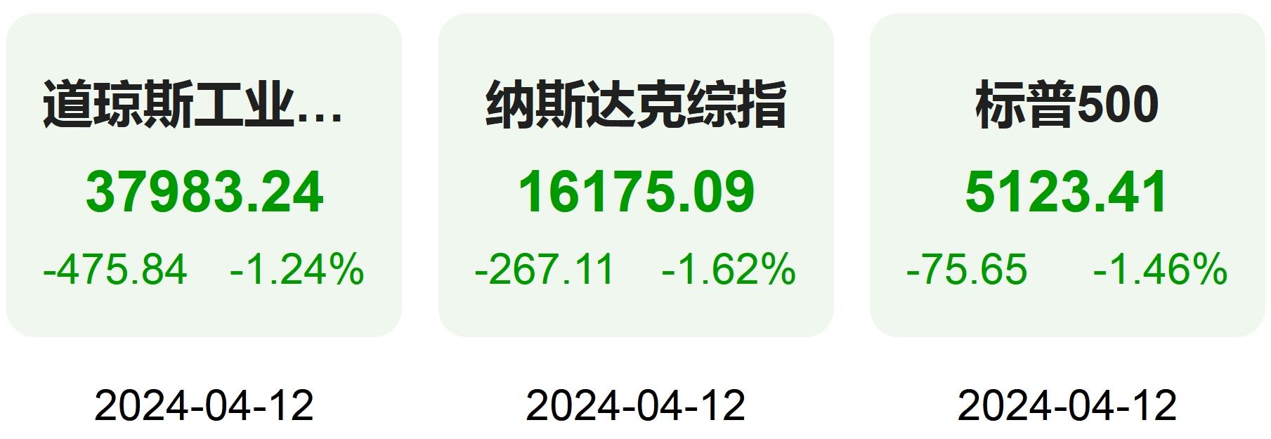 4月15日消息,上周五,美股三大指数全线跌超1%,标普500跌幅为五个月以来最大。美联储上半年降息预期连续遭受打压、地缘政治局势骤然升级加上部分美国大型银行股财报喜忧参半,美股连续第二周收跌。
