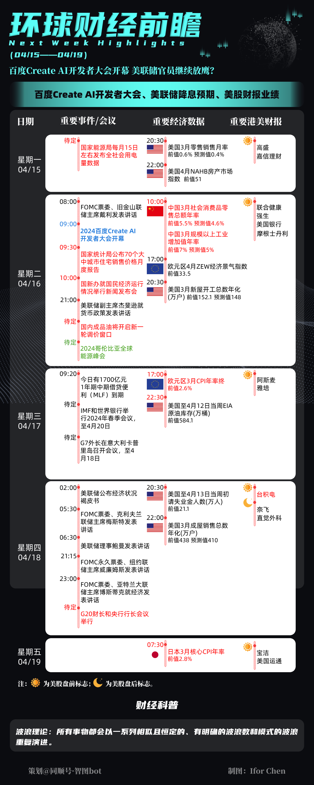 另外,美股财报季也是当前市场一大不确定因素,上周摩根大通公布Q1业绩后,股价大跌超6%。尽管该银行营收和利润均超出预期,但其全年净利息收入展望略低于分析师预期。摩根大通CEO还警告称,持续的通胀压力正在拖累经济。