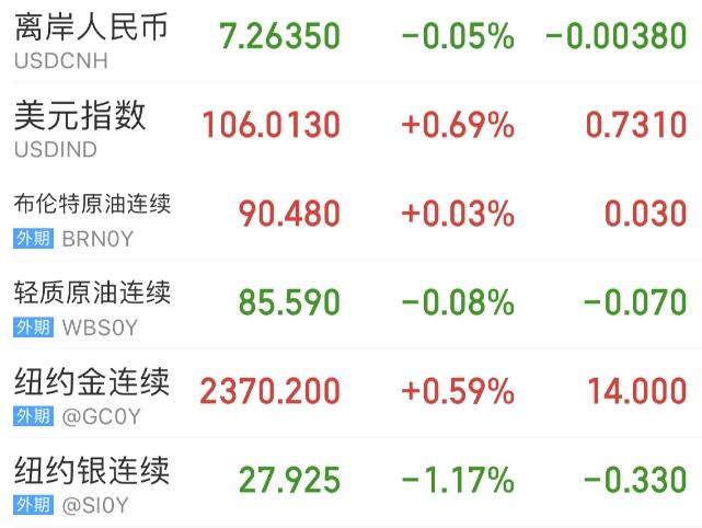 原油同样由于地缘政治紧张局势引发市场担忧供应中断,油价盘中飙升。WTI原油一度大涨3%,在触及87关口后急转直下,回吐日内全部涨幅,最终收跌0.08%,报85.59美元/桶;布伦特原油收涨0.03%,报90.48美元/桶。