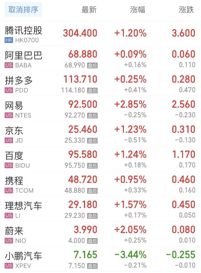 热门中概股方面,腾讯控股(港股)涨1.20%,阿里巴巴涨0.09%,拼多多涨0.25%,网易涨2.85%,百度涨1.24%,携程涨0.95%,理想汽车涨1.57%,蔚来涨2.05%,小鹏汽车跌3.44%。
