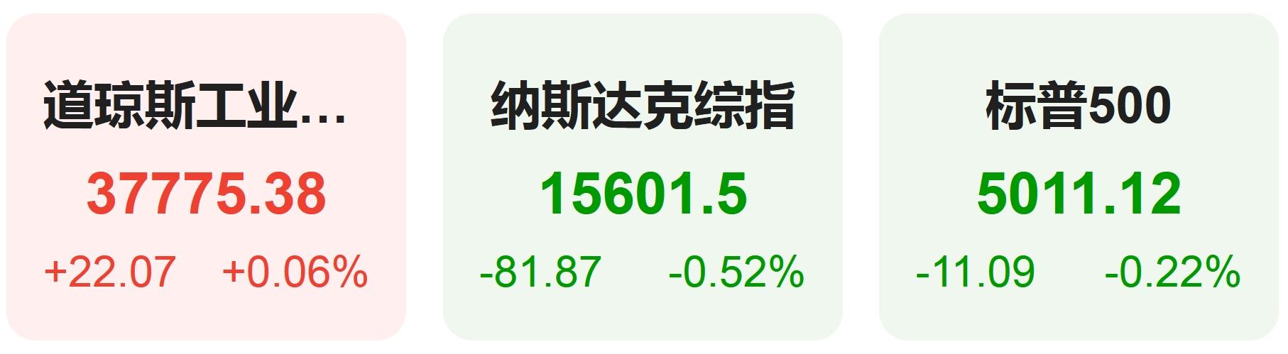 截至收盘,标普500指数跌0.22%,报5011.12点;道琼斯指数涨0.06%,报37775.38点;纳斯达克指数跌0.52%,报15601.50点。