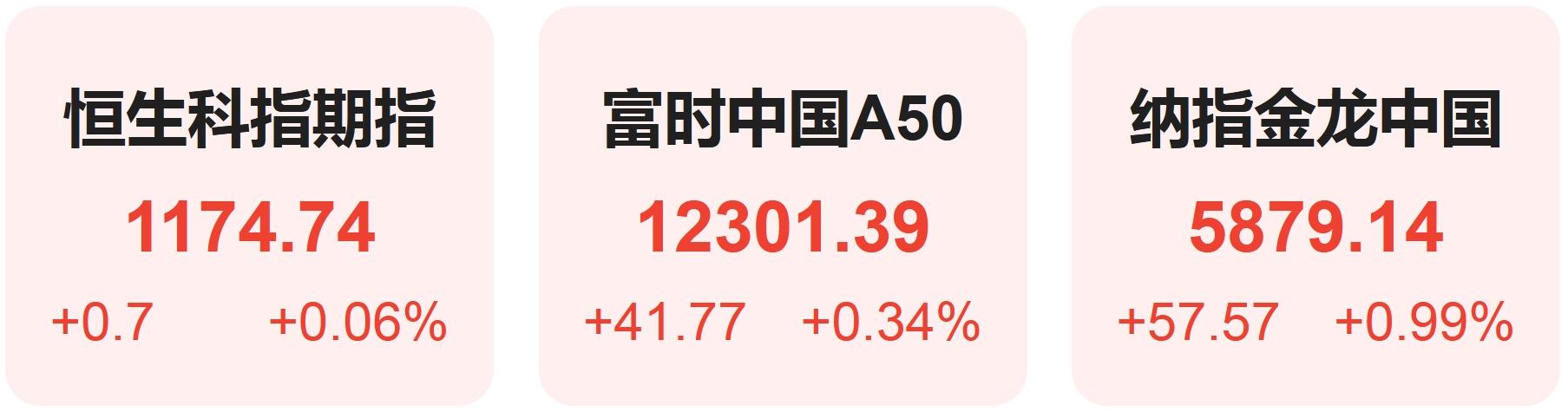 隔夜恒生科技指数期货上涨0.06%,纳斯达克中国金龙指数上涨0.99%,富时中国A50指数上涨0.34%。