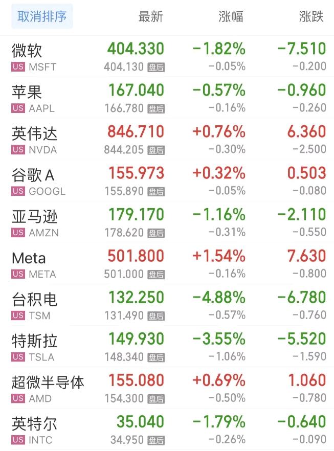 热门美股中,微软跌1.82%,苹果跌0.57%,英伟达涨0.76%,谷歌A涨0.32%,亚马逊跌1.16%,超微半导体涨0.69%,英特尔跌1.79%。