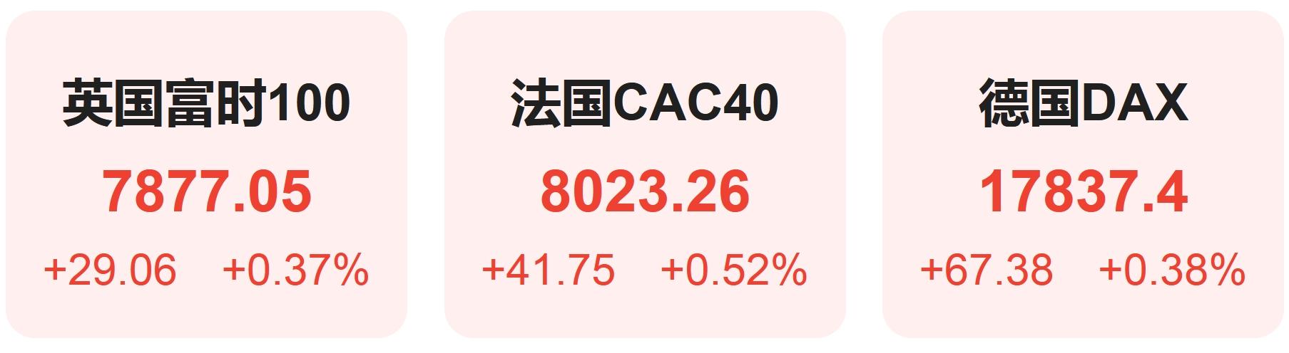 欧洲股市方面,英国富时100指数小幅上涨0.37%,报7877点。法国CAC40指数小幅上涨0.52%,报8023点。德国DAX指数小幅上涨0.38%,报17837点。