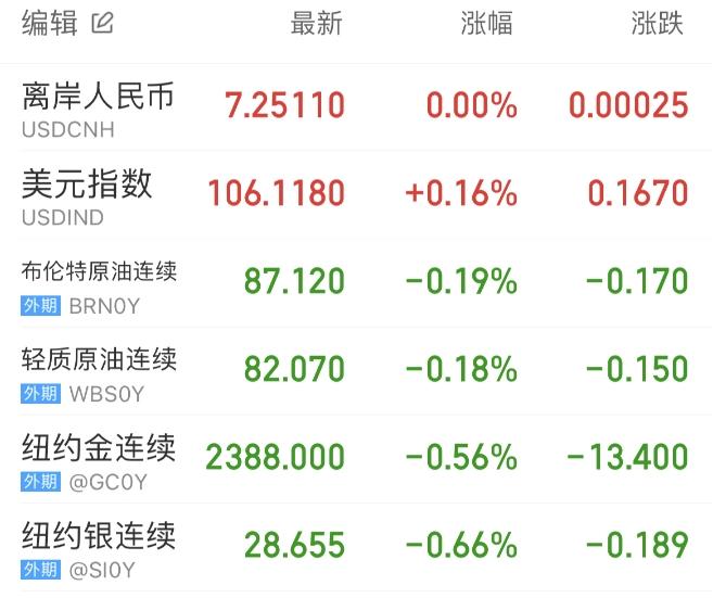 地缘局势紧张一度引发了原油供应中断的担忧,WTI原油盘中大涨但随后回吐日内全部涨幅,最终收涨0.04%,报82.13美元/桶;布伦特原油收涨0.32,报87.39美元/桶。